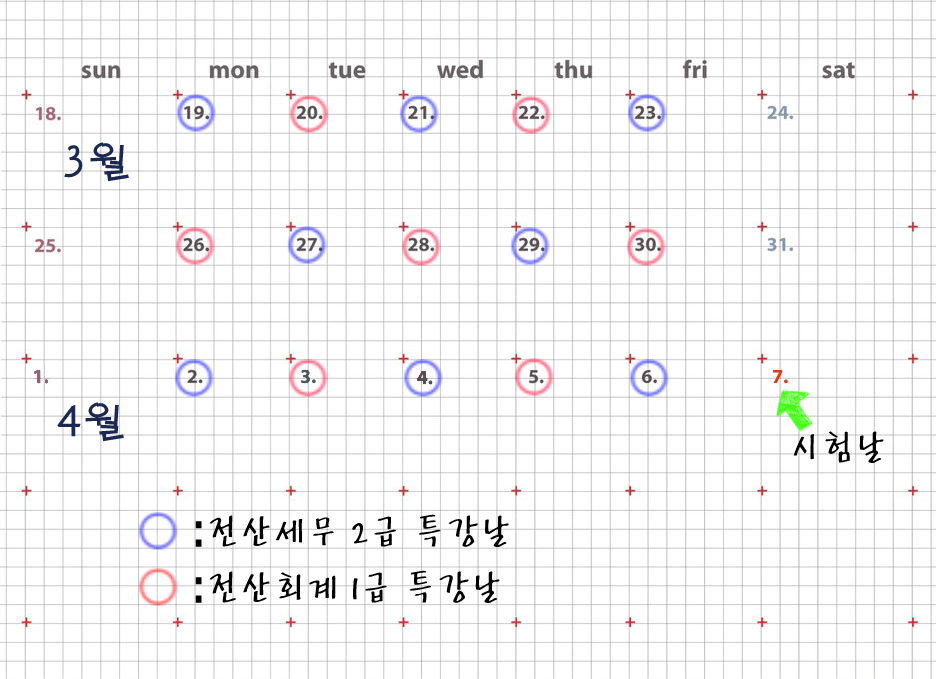 구로 캠퍼스 [특강]전산세무회계 실기시험대비 Post. 2012.03.14 전산세무회계시험이 업그레이드된 버전으로 실기위주 특강이 열립니다. 기존 네오플러스(Neo plus)에서 아이플러스(i-plus)로 실기프로그램이 변동되어 아직 대비가 안되신 분들에게 추천해 드립니다. 전산세무2급과 전산회계1급 강의 일정은 아래의 달력을 확인하시면 됩니다. 시간은 저녁 19:20 ~ 22:20 입니다. 개강은 19일과 20일 양일간 회계는 7일, 세무는 8일 과정으로 진행이 됩니다. 선착순 마감이오니 자세한 사항은 바로 연락주시기 바랍니다. 대표전화 : 02-3667-0008